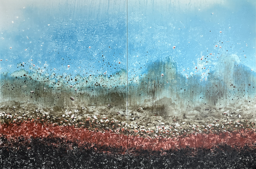 Upphaflega hugmyndin að verkinu vaknaði þegar ég keyrði Ísafjarðardjúp í júní 2023, á leið í strandhreinsun á Hornströndum og var alveg gáttuð yfir þessari rauðu rönd í berginu sem sást víða þar sem sprengt hafði verið fyrir vegagerð. Ég fór að kynna mér málin og komst að því að rauða röndin stafar af því að á Íslandi ríkti hitabeltisloftslag fyrir um 6-7 milljónum árum þar sem pálma- og bananatré og annar hitabeltisgróður þakti landið en við miklar hamfarir oxideraðist þetta efni og steingerðist eða sameinaðist gosefnum og fékk þennan rauða lit.
