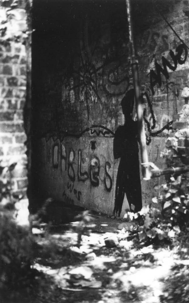 Ljósmynd af Guðrúnu niður við Hudson river í Inwood Park N.Y.C. þar sem hún dvaldi mikið við að mála sumarið 1982. Bæði málaði hún á steina og allt sem fyrir var og á dagblöð. Máluð dagblöð voru einnig límd upp í kofum á svæðinu og undir brýr. Ljósmyndir af henni er stór hluti heildarverksins enda í raun um innsetningar og gjörninga yfir heilt sumar að ræða.