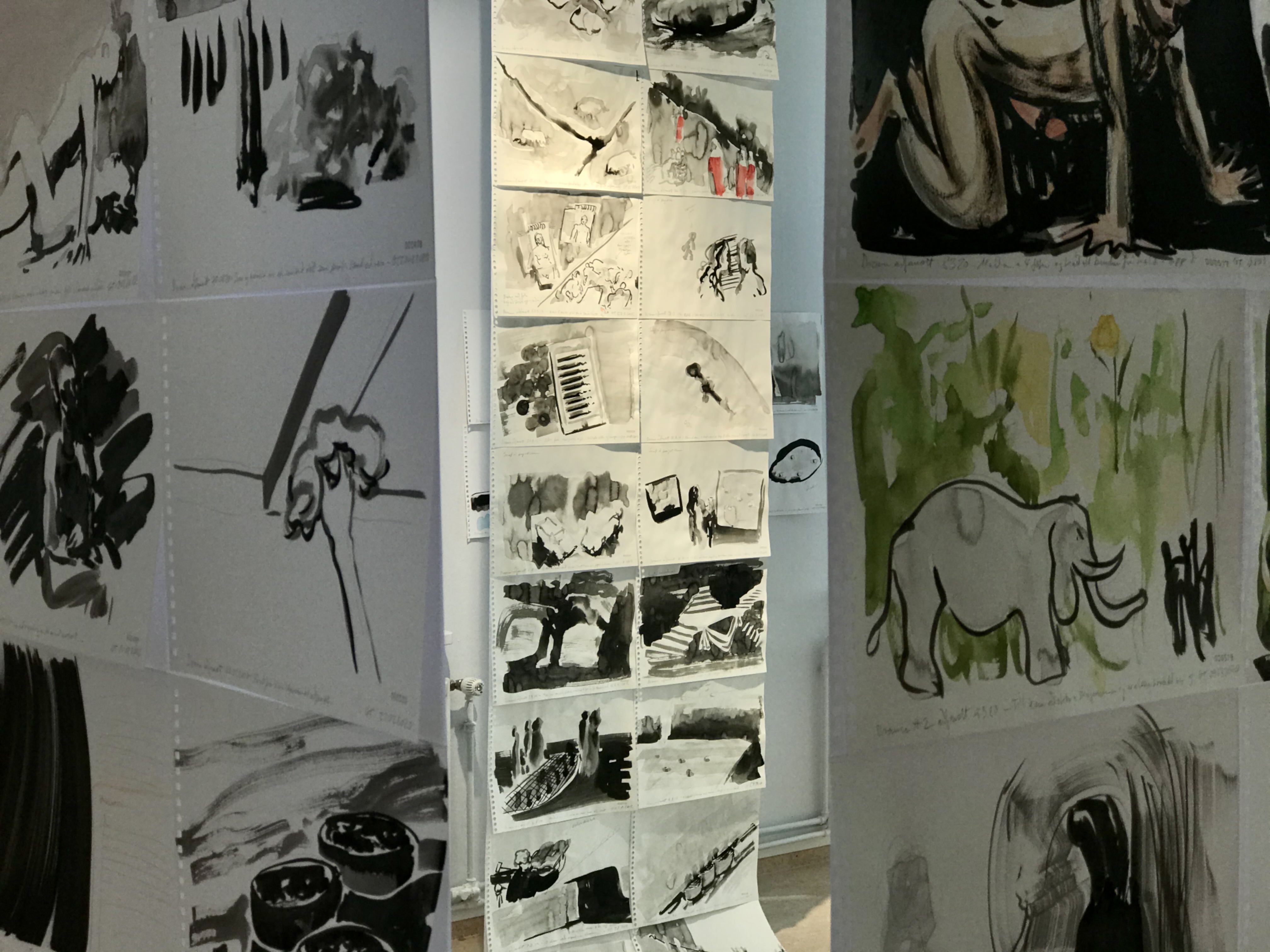 „Á þessari sýningu sem fengið hefur heitið Vakning, má sjá blekteikningar sem myndlistarmaðurinn Guðrún A. Tryggvadóttir hefur dregið upp á hverjum morgni þegar vakning tekur við af svefni. Þetta hefur hún gert allt frá 9. ágúst 2018 og eru blöðin farin að nálgast þúsund stykki. Guðrún lítur ekki á myndirnar sem sjálfstæð listaverk, en þær bera vissulega handbragð myndlistarmanns, eru dregnar með hröðum hreyfingum, oftast með misþynntu svörtu bleki og grípur eintöku sinnum til vatnslita þegar litir koma meðvitað fyrir í draumi. Markmiðið er að ná því á blað sem eftir lifir af draumum næturinnar án þess að einblína á myndbyggingu eða aðra listrænar undirstöður og er hvert blað unnið á aðeins örfáum mínútum. Hvatinn að þessum skráningum er meðvituð sjálfsskoðun þar sem kafað er á dulin djúp hins ómeðvitaða, en sjálfsskoðun er samnefnari yfir myndlist Guðrúnar nú sem fyrr.