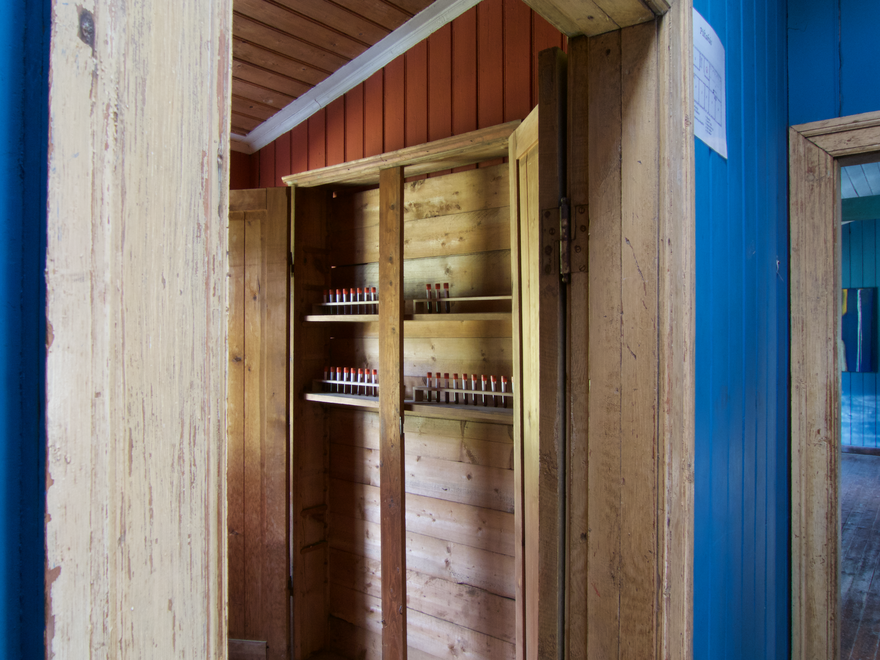 Innsetning / Gamall skápur og blóðsýnisglös í viðarstöndum