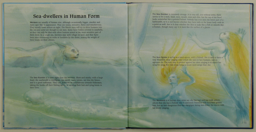 Opna bls. 10-11 í bókinni Furðudýr í íslenskum þjóðsögum. Myndefni: Sæbúar í mannslíki.Myndskreyting: Guðrún Tryggvadóttir.
