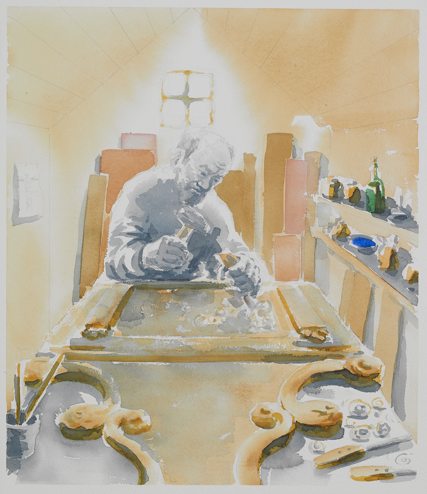 Ámundi vinnur að altaristöflu (Þjms. 6163) sem hann gerði líklega um 1788, þá um fimmtugt.