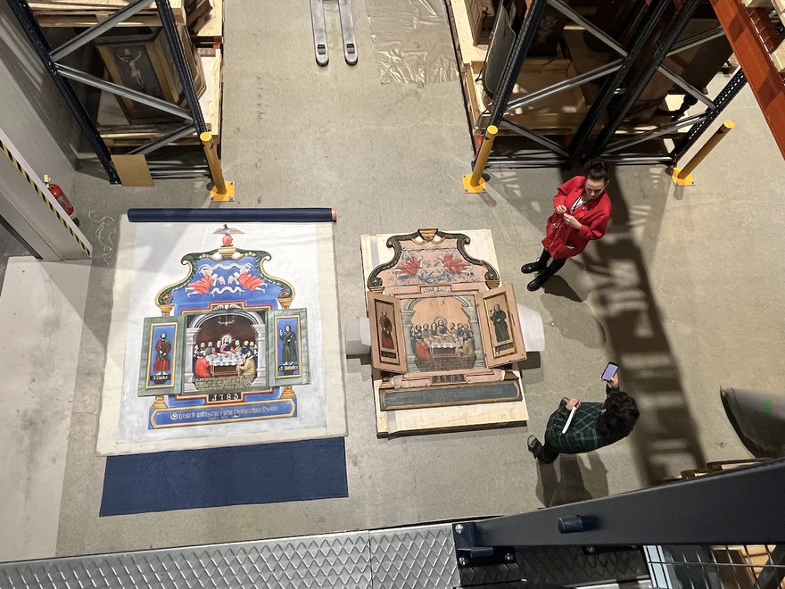Ornaturm / altaristafla / altarpiece: An altarpiece is a work of art in painting, sculpture or relief representing a religious subject made for placing at the backk of or behind the altar of a Christian church.