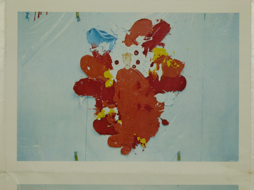 Framlag mitt til samkeppninnar Kunst und Fruchtsaft var sjálfsmynd í appelsínugulum flugmannasamfestingi. Minn daglegi fatnaður. Ég hellti plastmálningu á plast og lét þorna og hengdi þannig upp á vegg. Liturinn er ávaxtasafinn minn.