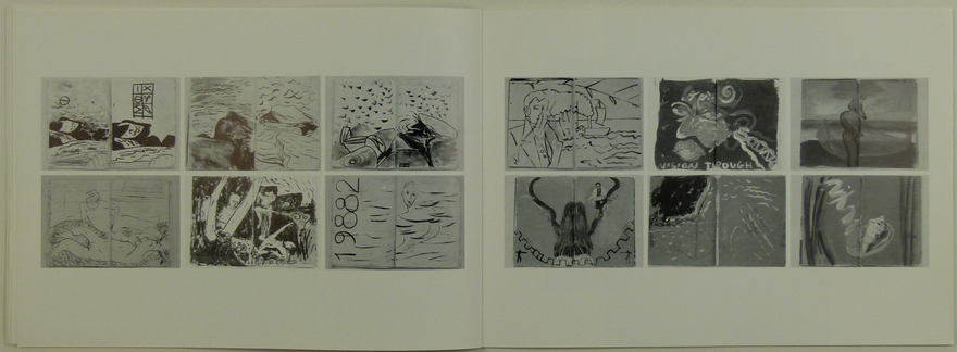 Á vinstri blaðsíðu: 6 dagblaðaopnur. Hvít málning og túss á bandarísk dagblöð, 60x40 cm. 1982.